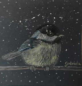 2020Kleurpotlood tekening op donkerblauw papier van een zwarte mees in de sneeuw.