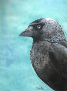 Tekening van pen, ecoline en kleurpotlood van een kauw.
